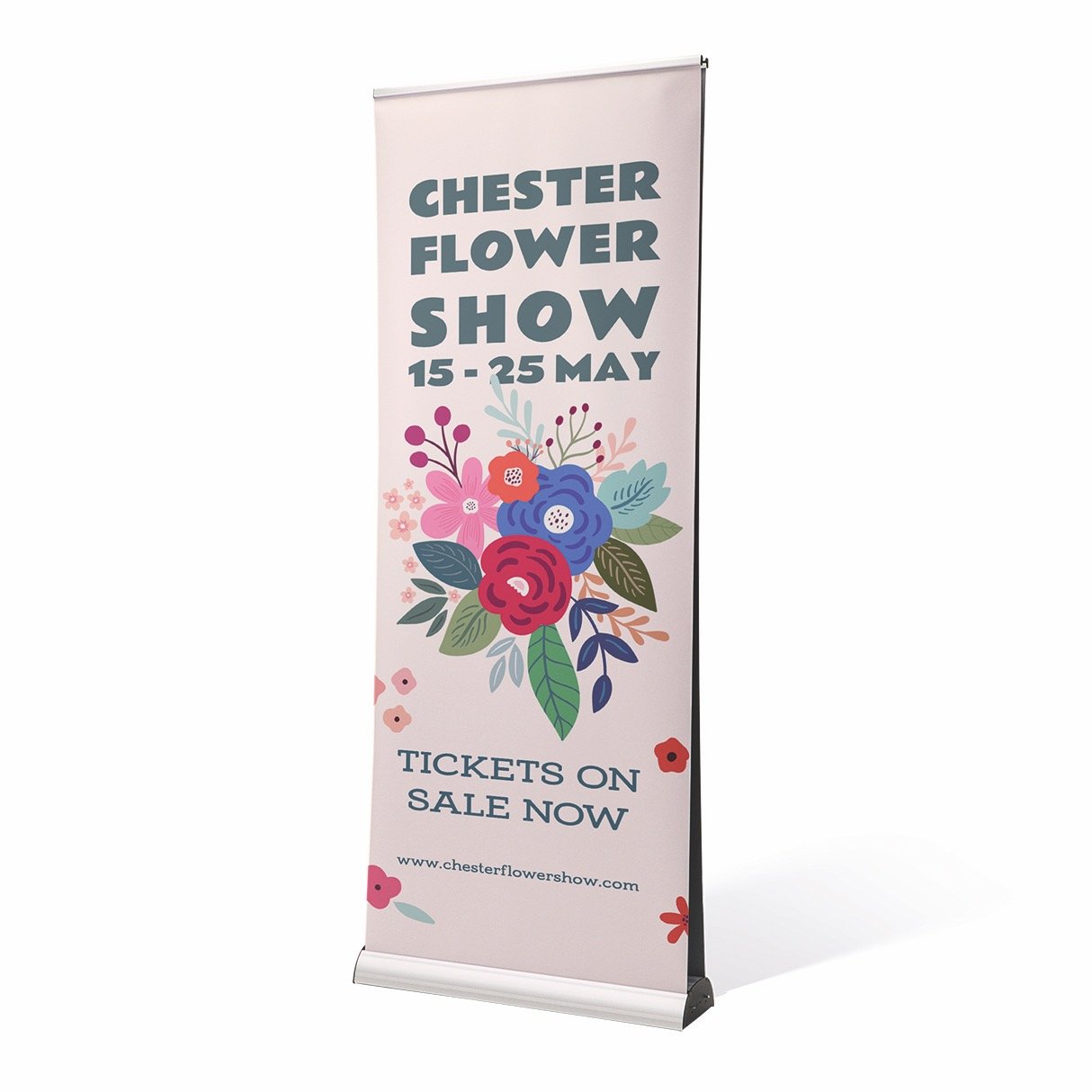 Each banner comes with a sturdy aluminium base and chrome end plates, weighing around 5kg for stability and easy transport. Use them at conferences, product launches, or in shop windows, wherever they go, your message stands tall.